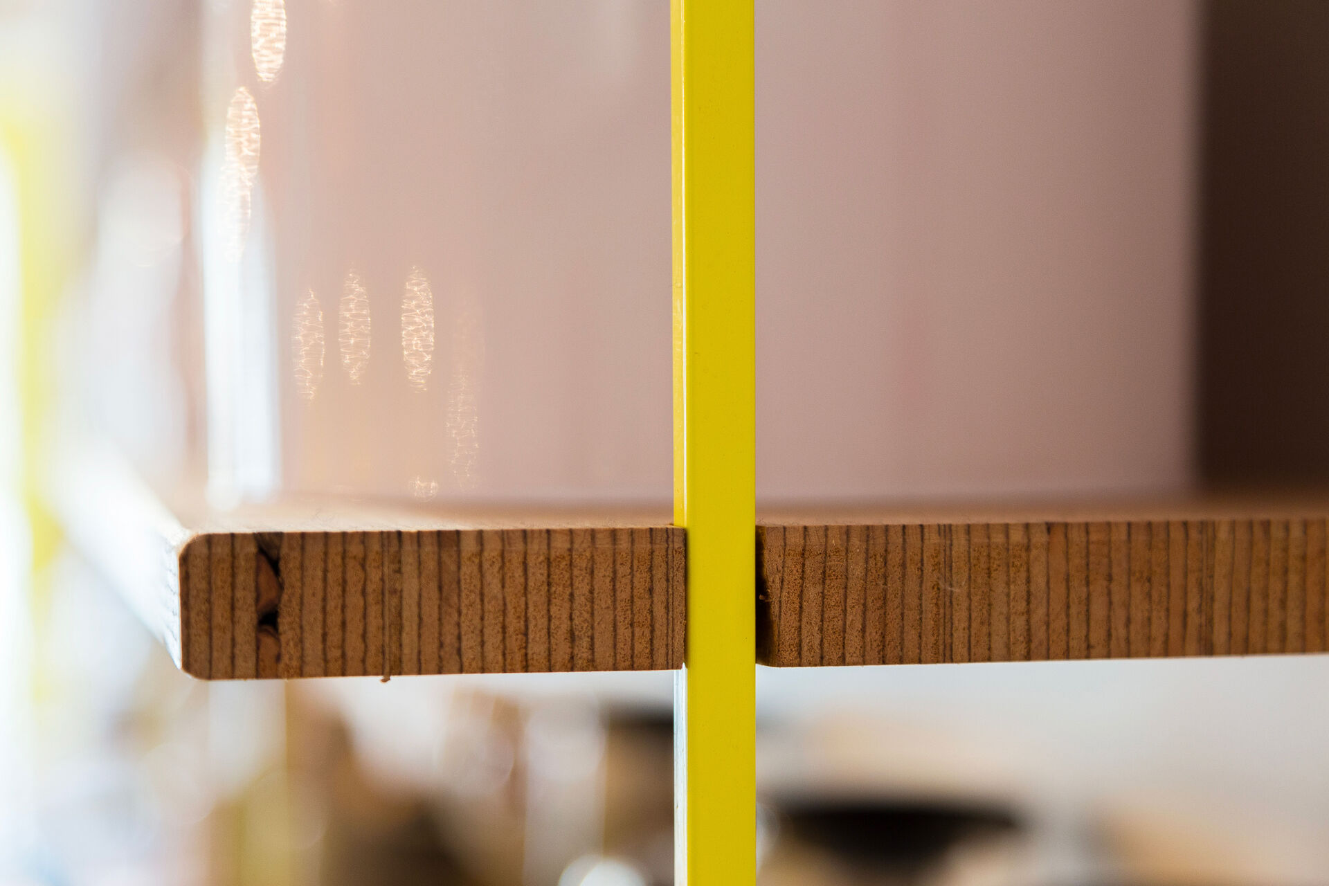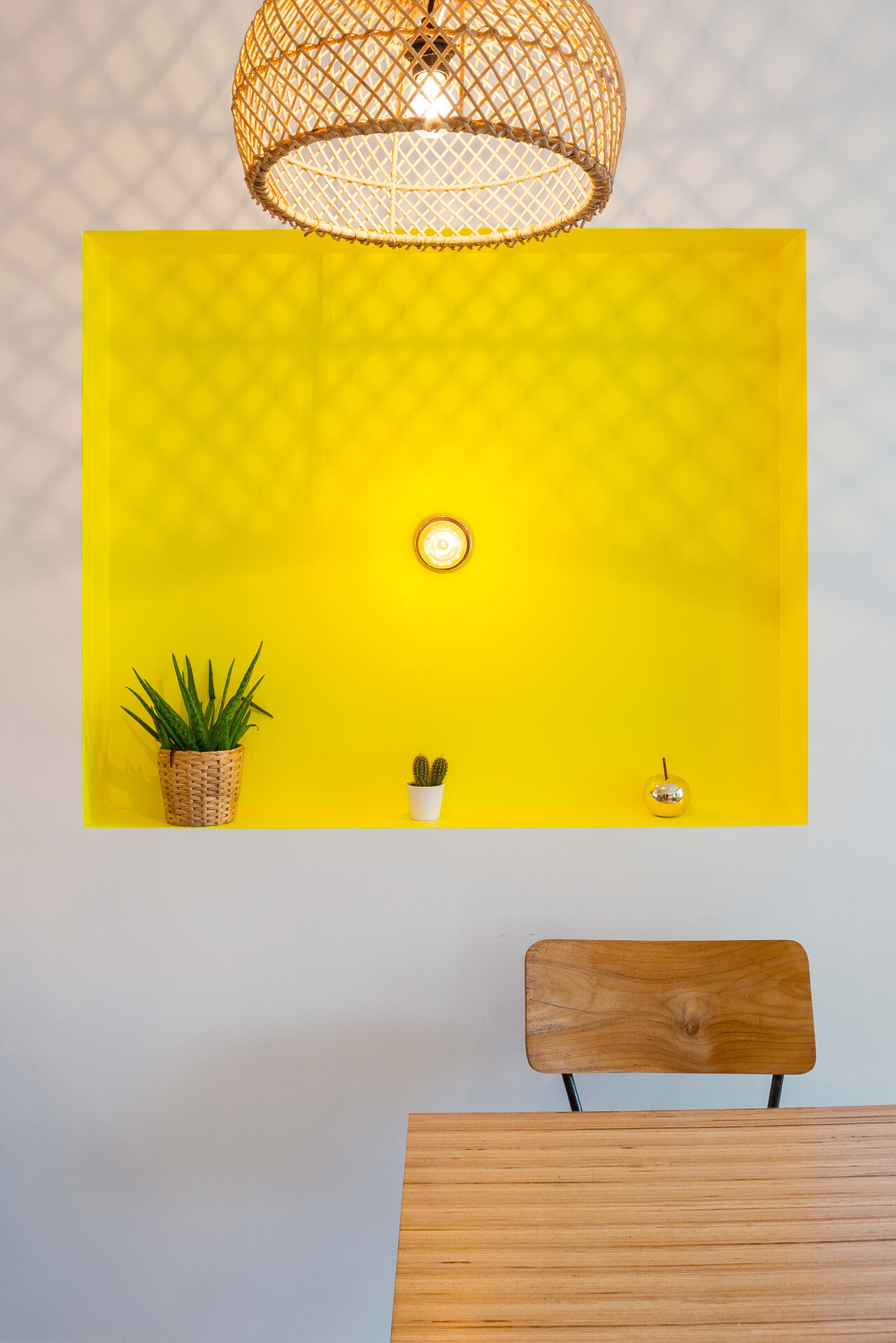 Le jaune vitaminé, signature de la marque, s’invite en niches lumineuses, en détails graphiques, en touches rythmant le regard. Il dialogue avec le bois naturel, doux et tactile, et avec la pierre blonde de la façade, inscrivant l’ensemble dans une ambiance fraîche, accessible et contemporaine.