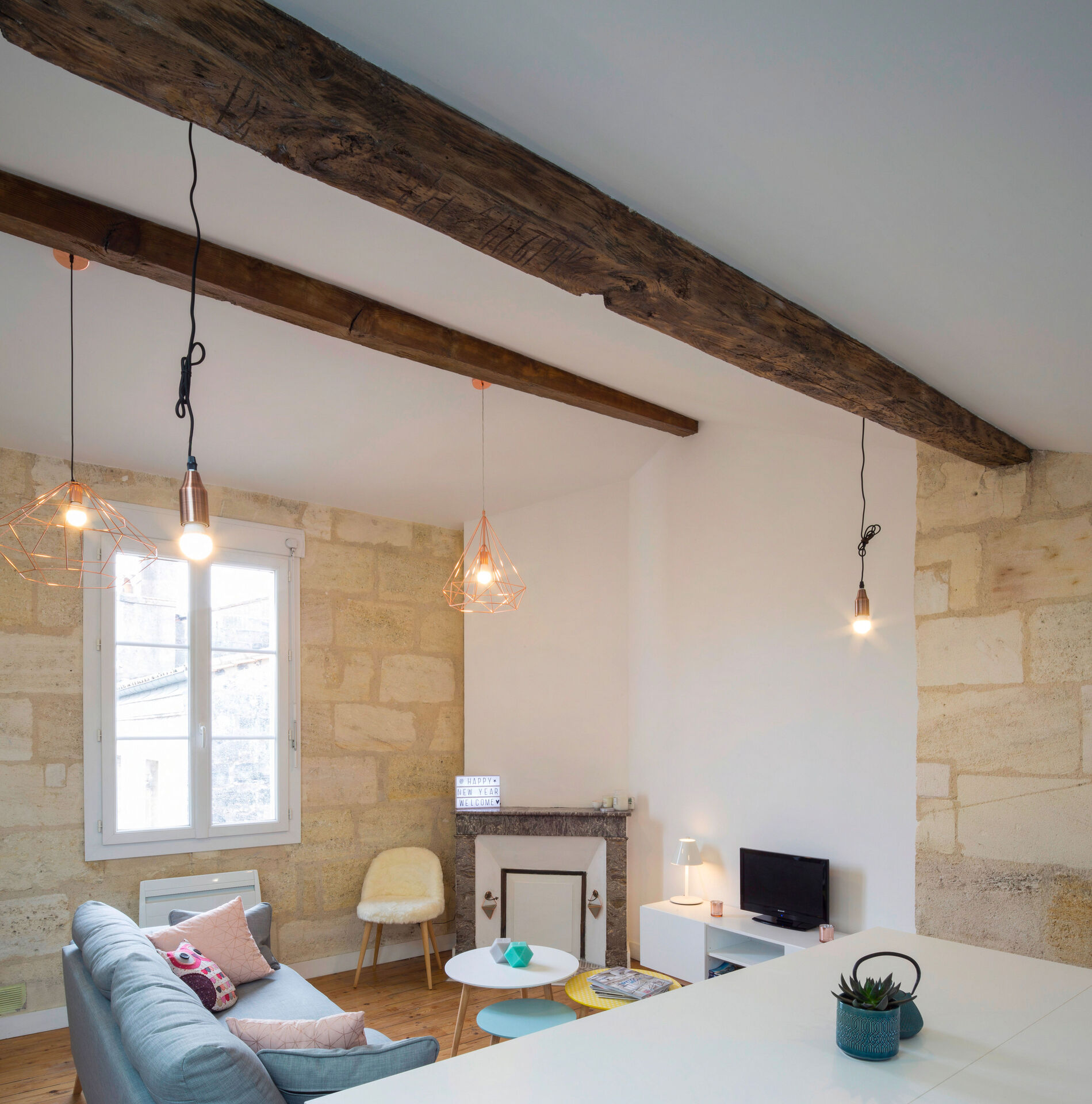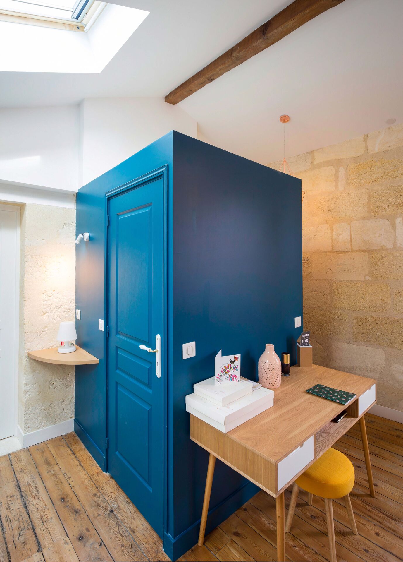 L’intervention d’AKIKO Architecture s’est concentrée sur la valorisation du volume atypique, la fluidité des circulations et l’exploitation millimétrée de chaque recoin. Les matériaux bruts historiques — pierre blonde, plancher ancien, poutres apparentes — dialoguent désormais avec des lignes contemporaines, des teintes douces et un mobilier sur-mesure pensé pour optimiser le moindre espace.