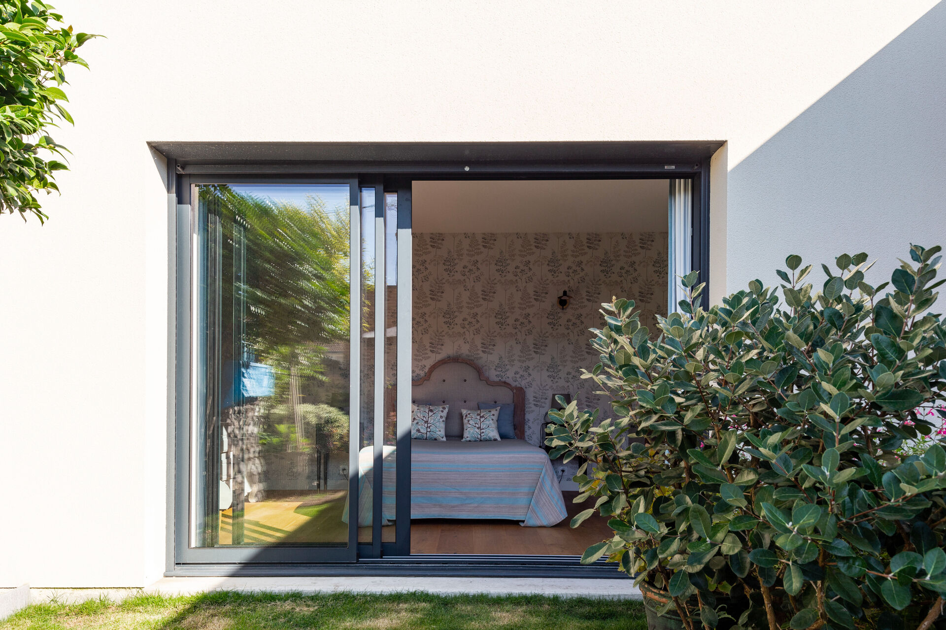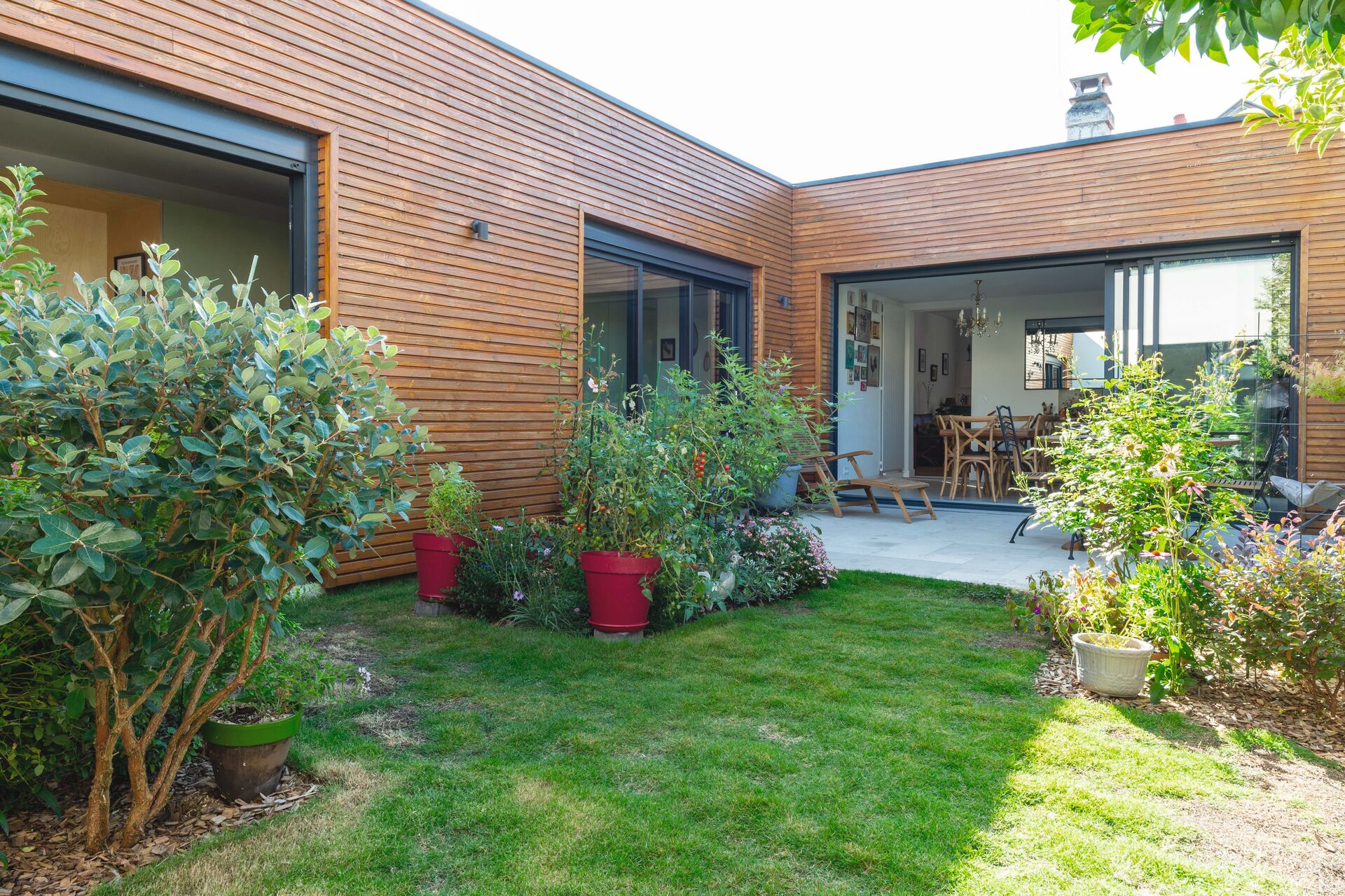 Dès l’esquisse, nous avons intégré une façade contemporaine, une toiture terrasse, et de larges ouvertures sur l’extérieur pour capter la lumière et favoriser l’immersion dans le jardin. Une liaison entre le volume de la maison existante et le volume de la dépendance en fond de jardin permet la sensation de toujours être au contact du jardin, cher à notre cliente. La maison semble tourner autour de cet écrin de verdure, créant un véritable cocon de verdure autour d’un patio jardin central.
